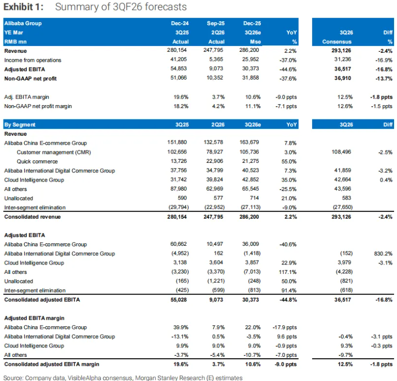 眼下2025年第四季度刚过,文章这里一起来看看摩根士丹利(大摩)最新对于阿里2026Q3 (自然年2025Q4) 的业绩前瞻。