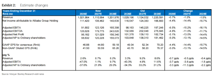 此外,大摩还下调全年业绩预测,认为阿里2026财年营收同比微增2.6%,调整后归母净利润为986.32亿,同比下降37.6%。