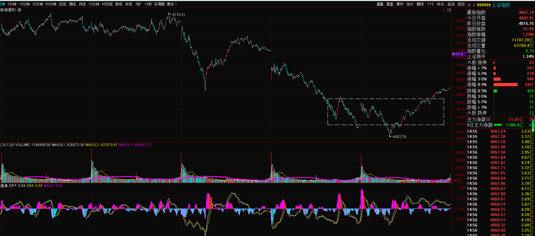 从技术上看,调整之后市场形成了集体反弹,不过这个反弹量能是萎缩的,所以只能说是超跌反抽,目前的压力位是之前15分钟级别中枢4080点附近,而支撑位4050点,明天预计还有回踩,这个回踩如果不破4050点的话,调整大概率就结束了。